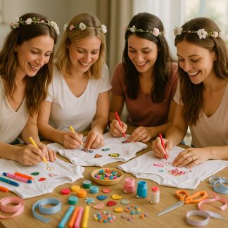 La tête, premier point d’attention sur les photos de groupe… Elle mérite un accessoire à la hauteur. Couronne de fleurs pour la future mariée, serre-têtes à messages pour la team, chapeaux de paille pour un EVJF champêtre ou bibi pailleté pour une virée citadine : l’idée est de personnaliser sans caricaturer.